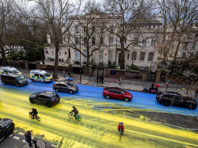 Outside of the Russian embassy in London, the asphalt has been painted with a big Ukraine flag. The flag first appeared the day before Russia’s…