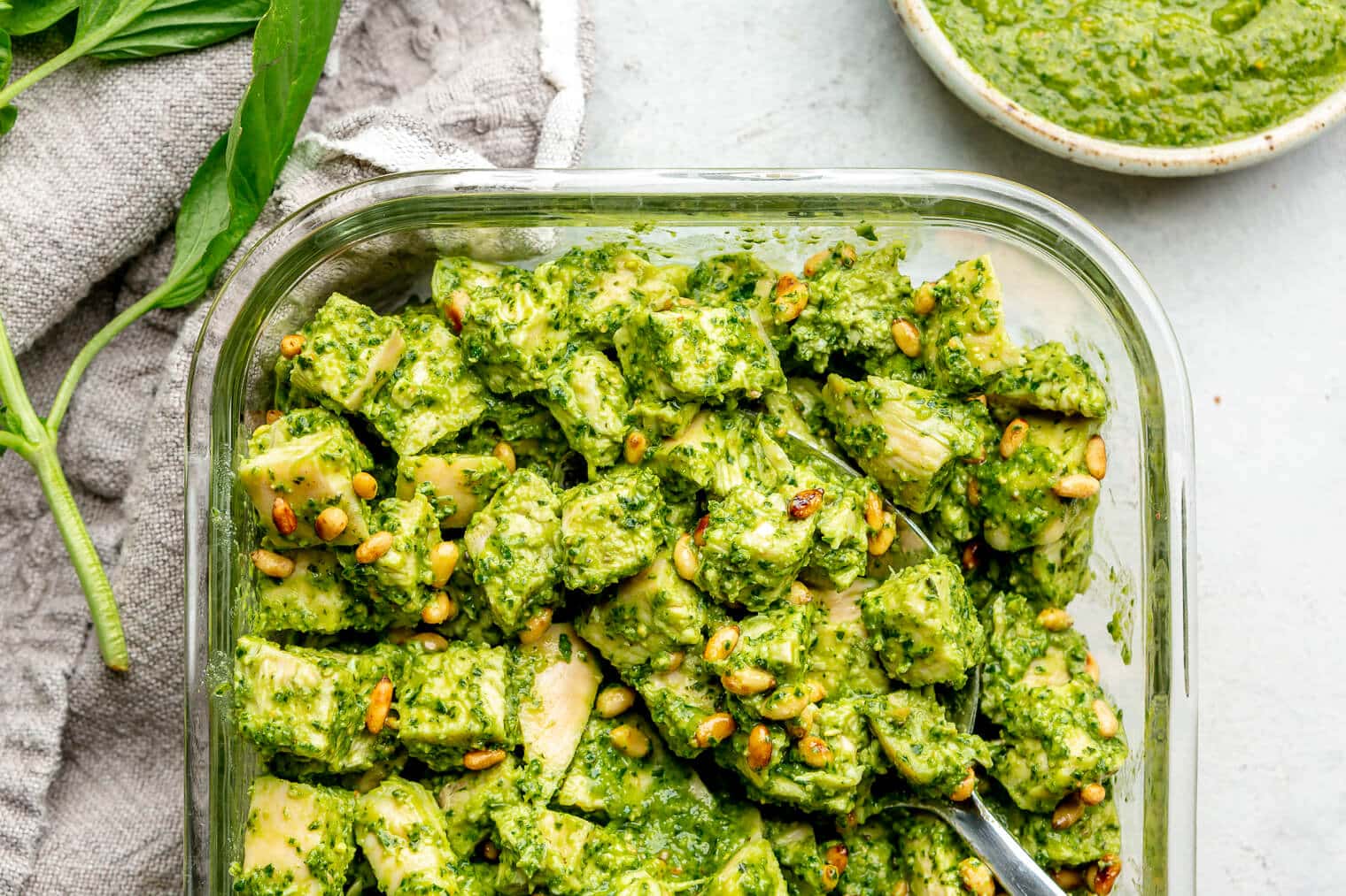 Pesto – this recipe was written specifically with our dairy-free roasted garlic pesto in mind. It’s top-notch and will be the most flavorful pesto option for your chicken salad, but if you don’t have the time to make it, feel free to grab a couple of jars (you’ll need about 2 cups total) from the store.
